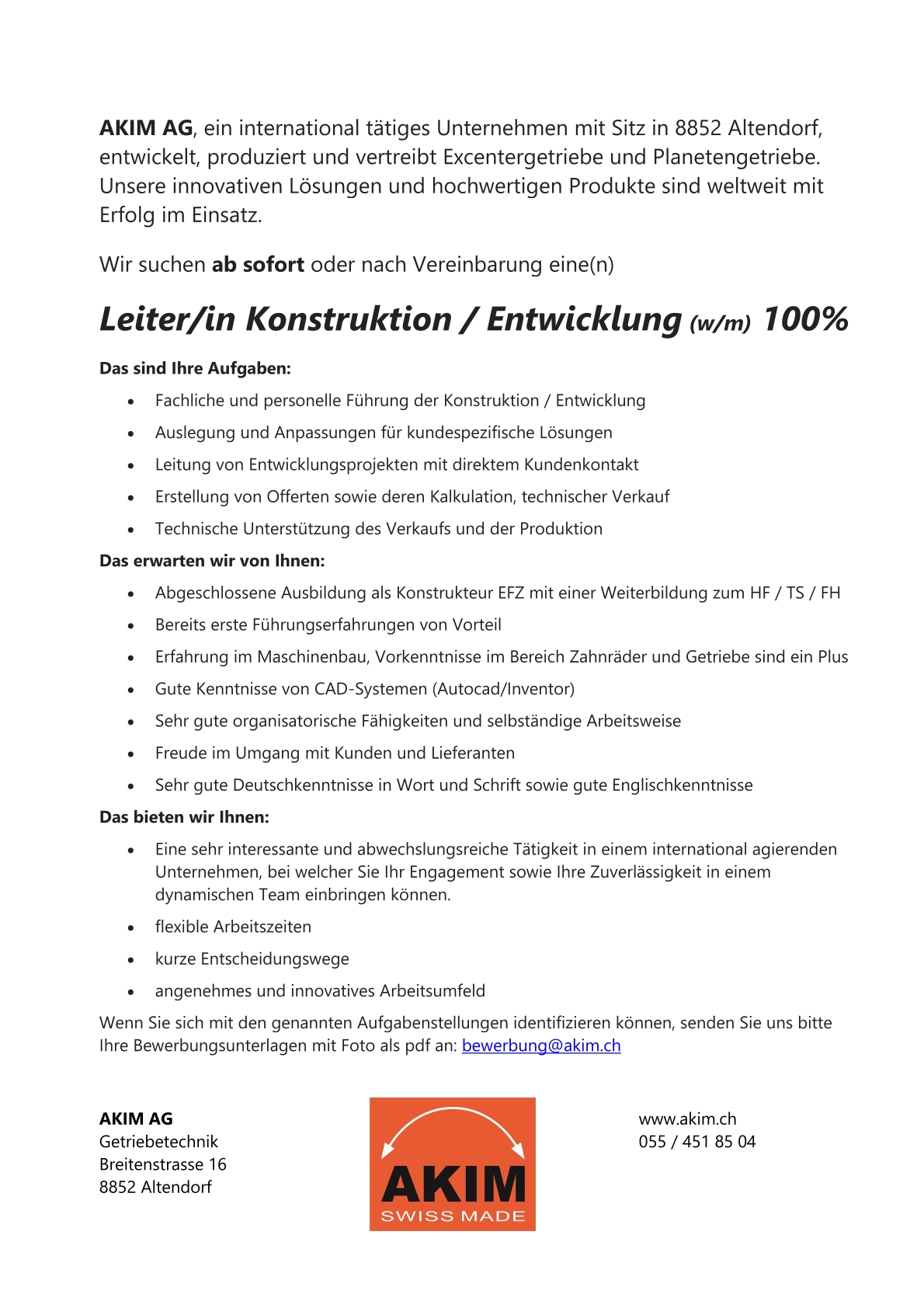 Leiter/in Konstruktion/Entwicklung (w/m) 100%